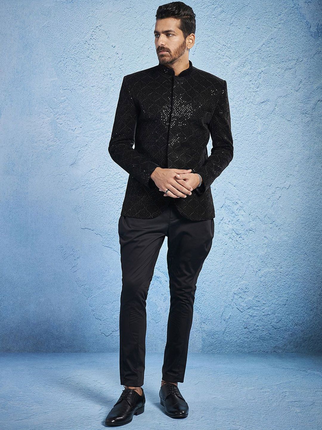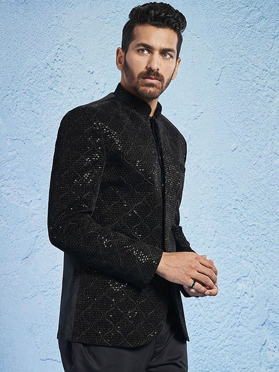 VASTRAMAY Embroidered Sequinned Mandarin Collar Slim-Fit Velvet Bandhgala Blazers