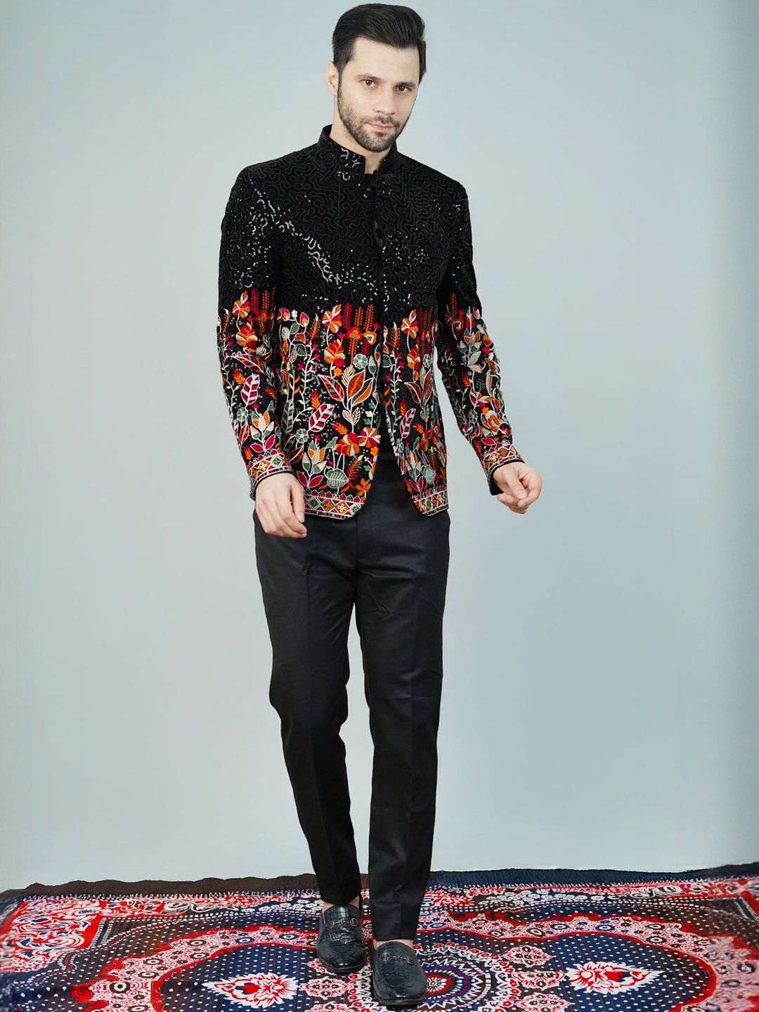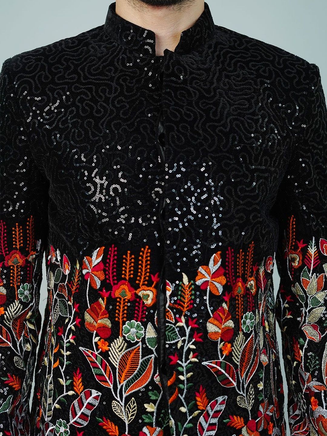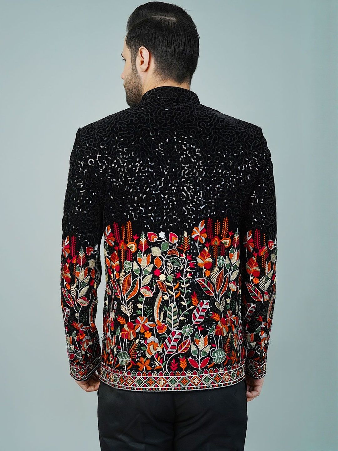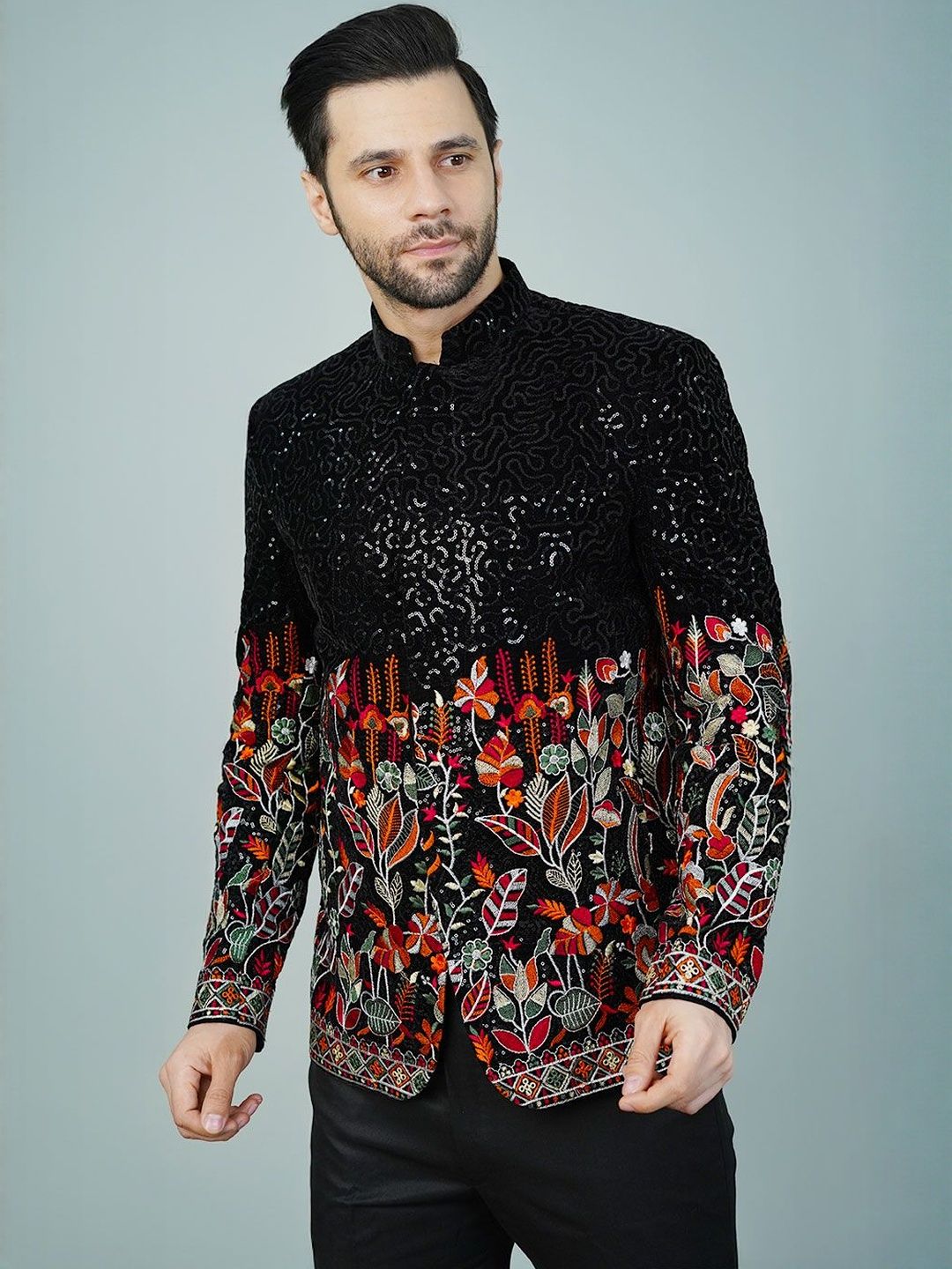 Wintage Self Design Embroidered Mandarin Collar Black Bandhgala Blazer