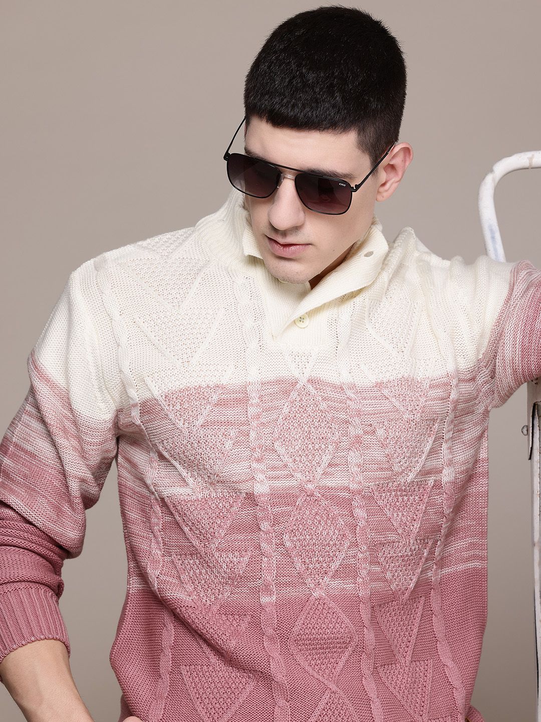 The Roadster Lifestyle Co. Men Blue & Cream-Coloured Cable Knit Pullover